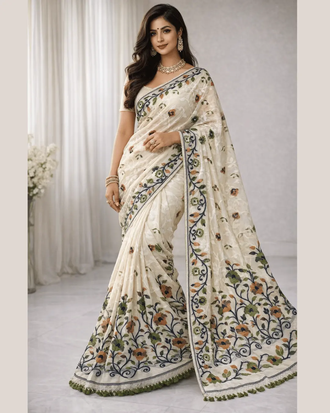 Dhakai Jamdani is renowned for its intricate motifs, painstakingly woven by hand using the discontinuous weft technique. In a Neel Megh Jamdani saree, these motifs—often inspired by nature such as flowers, paisleys, vines, or geometric forms—stand out gracefully against the blue background. The contrast creates a subtle yet striking visual effect, making the saree elegant without being overpowering.